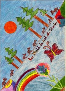 Ich sprang in die Luft und glitt mit dem Wind um meine Schwingen über eine bunte Welt. Unter mir wogten Felder mit Blumen. Rote Mohnblumen, lila Schlüsselblumen und der Wind trug mich in rasantem Tempo auf zwei Berge zu, um deren Spitzen sich rosa Wolken versammelten.